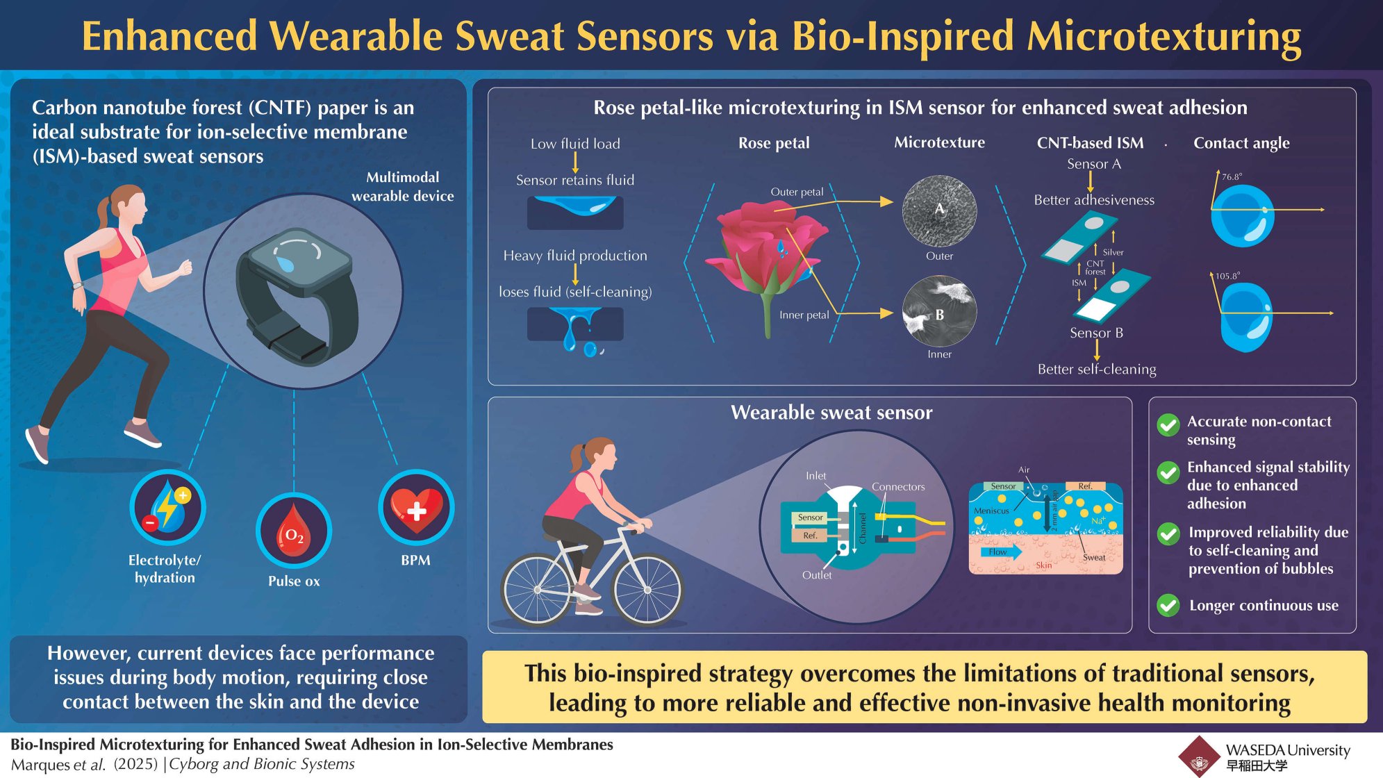This isn’t solely disagreeable for the wearer, however long run use may also result in infections and different nasty situations. Fortuitously, we could also be on the verge of a greater answer. A gaggle led by engineers at Waseda College has developed a wearable sweat sensor that’s snug and will be loosely worn. This was made attainable by borrowing some floor options from rose petals, which exhibit a singular wetting habits, and patterning them onto their sensor.