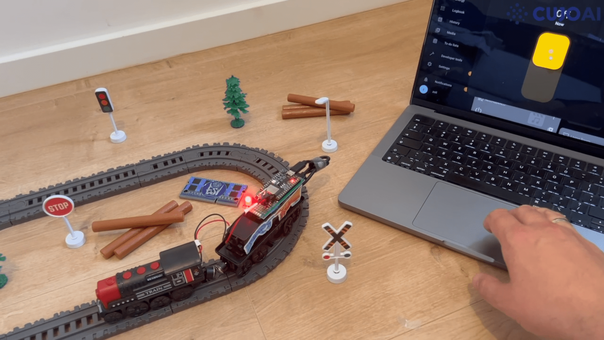As a place to begin, Balazs picked up an affordable — and positively not good — toy prepare. An ESP32-C3-DevkitM-1 board was then used to get some management over it. A MOSFET was wired between the prepare’s energy provide and motor, with a GPIO pin of the ESP32-C3 controlling the circulation of present. A CR123A rechargeable battery powers the event board, and the {hardware} was all caught on high of the prepare. That alone was sufficient to start out and cease the prepare on command, however a method of controlling this motion remotely was nonetheless wanted.