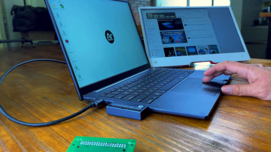 A canopy behind the laptop computer doubles as a heatsink for the Raspberry Pi CM5 and an elective M.2 NVMe SSD or accelerator. (📹: Argon Forty)