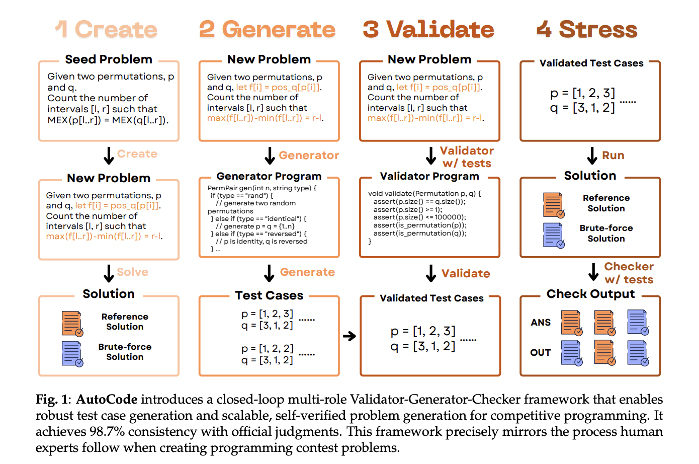 - AutoCode {couples} a Validator–Generator–Checker (+Interactor) loop with twin verification (reference vs. brute-force) to construct contest-grade check suites and new issues.