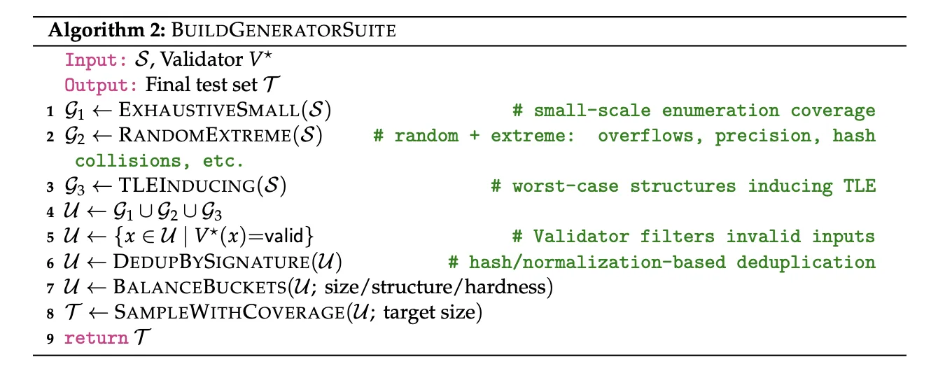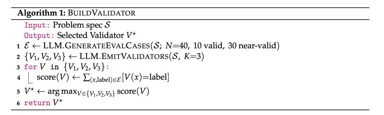 The system first asks an LLM to synthesize 40 analysis inputs—10 legitimate and 30 near-valid unlawful (e.g., off-by-one boundary violations). It then prompts the LLM for three candidate validator packages and selects the one which finest classifies these instances. This prevents “appropriate” options from crashing on malformed information.