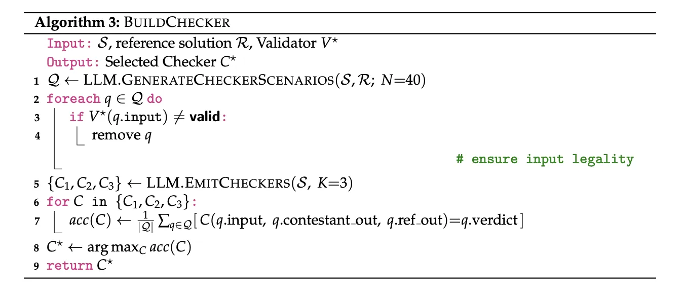 The checker compares contestant outputs with the reference answer beneath complicated guidelines. AutoCode once more generates 40 checker situations and three candidate checker packages, retains solely situations with validator-approved inputs, and selects the perfect checker by accuracy in opposition to the 40 labeled situations.