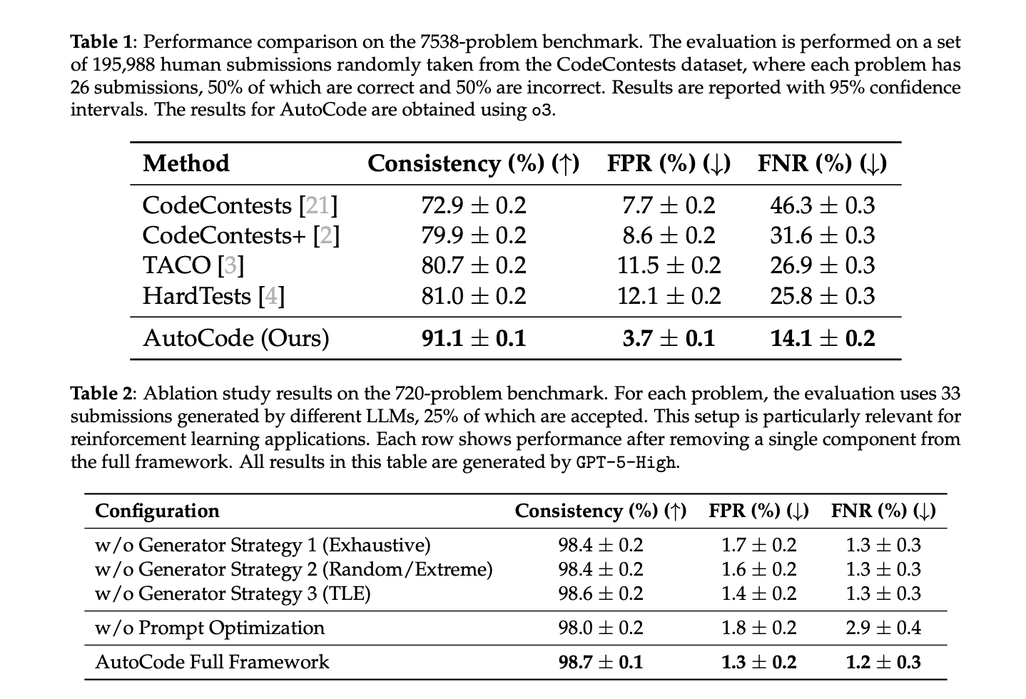 Public code benchmarks typically depend on under-specified assessments that permit wrong-complexity or shortcut options move. That inflates scores and pollutes reinforcement indicators (rewarding fragile techniques). AutoCode’s validator-first strategy and adversarial check era goal to cut back false positives (FPR)—incorrect packages that move—and false negatives (FNR)—appropriate packages rejected as a consequence of malformed inputs.