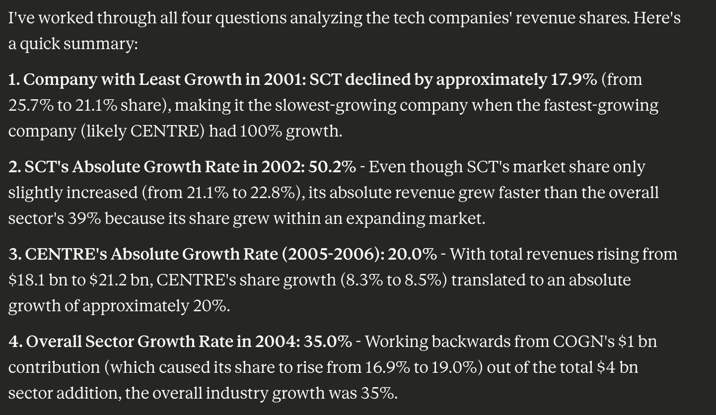 First reply is fallacious. The proper reply is 33%. First query had three components: first to search out the very best development firm, then to search out the slowest development firm after which the expansion of the slowest development firm. It accomplished the primary two components satisfactorily however in third half it solely calculated the change in income share.