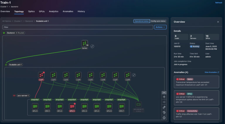 In an AI knowledge middle, this permits a unified expertise, simplified automation, and AI job observability. Utilizing Cisco Nexus Dashboard, operators can handle configurations and insurance policies for AI clusters and different materials from a single management level, considerably lowering deployment and change-management overhead.