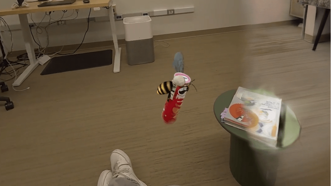 The phantasm works as a result of the system renders the robotic invisible to the headset wearer utilizing a classy approach known as 3D Gaussian splatting. This entails making a extremely detailed, three-dimensional scan of the room after which digitally portray over the robotic in order that the consumer by no means sees it of their passthrough view. As an alternative, they may see an animated bee fluttering throughout the room carrying their snack.