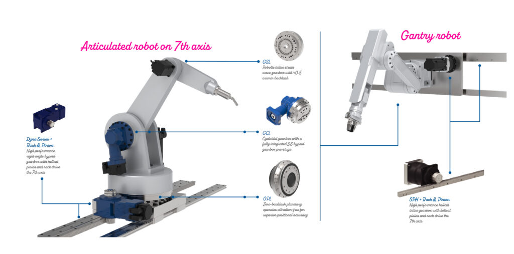 The seventh axis of floor-mount methods usually have a right-angle hypoid gearbox. Mostly “gantry” refers to Cartesian preparations … although suspended six-axis robots additionally qualify. These suspended gantries usually have a helical inline gearbox. Simply to be clear, each assist energy rack-and-pinion units having helical tooth geometries.