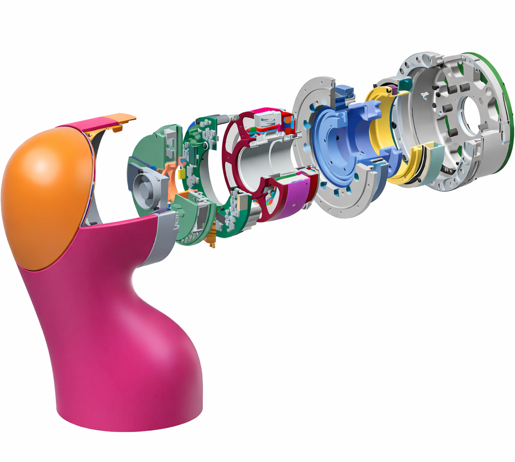 - Customized large-bore frameless motors (accepting 48-V enter) impart movement at every joint.