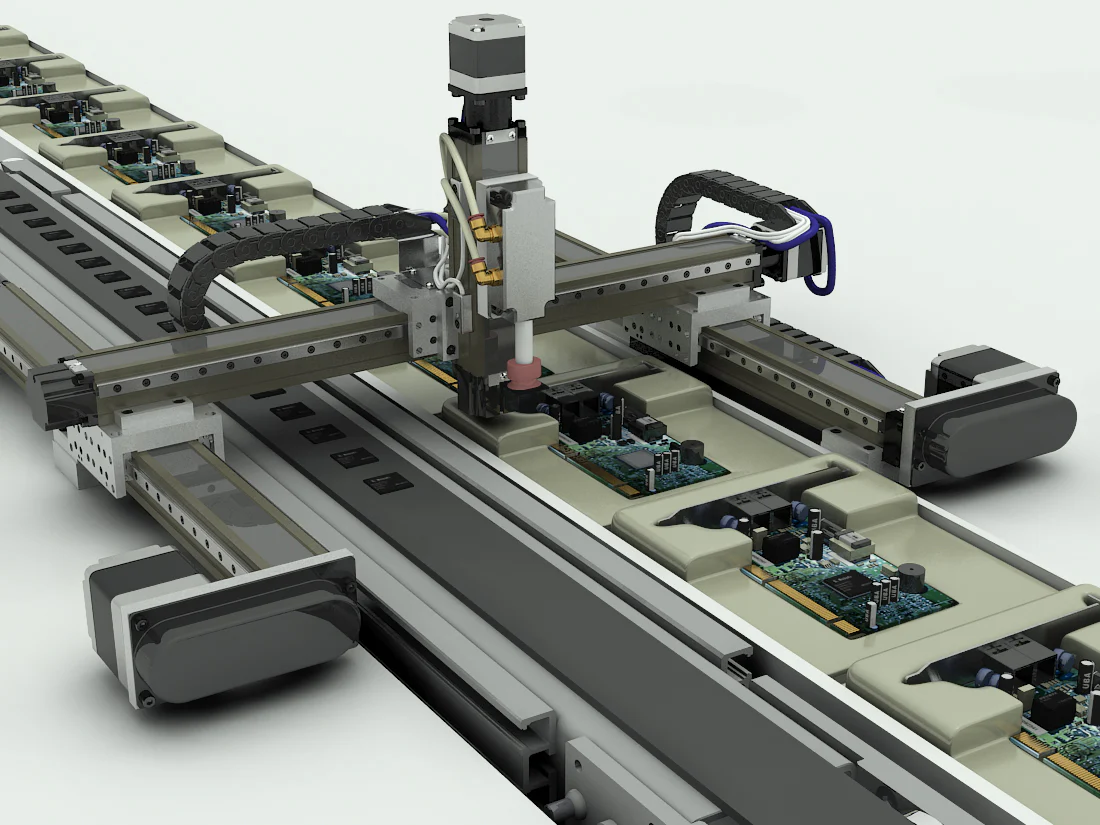 PBC Linear guides and belt or leadscrew-driven servo or stepper-motorized axes mix to type customized robotics for half dealing with, vision-based alignment, and different synchronized movement in packaging, meeting, and inspection. The instance right here is an association with stepper motors and screws to automate circuit-board meeting.