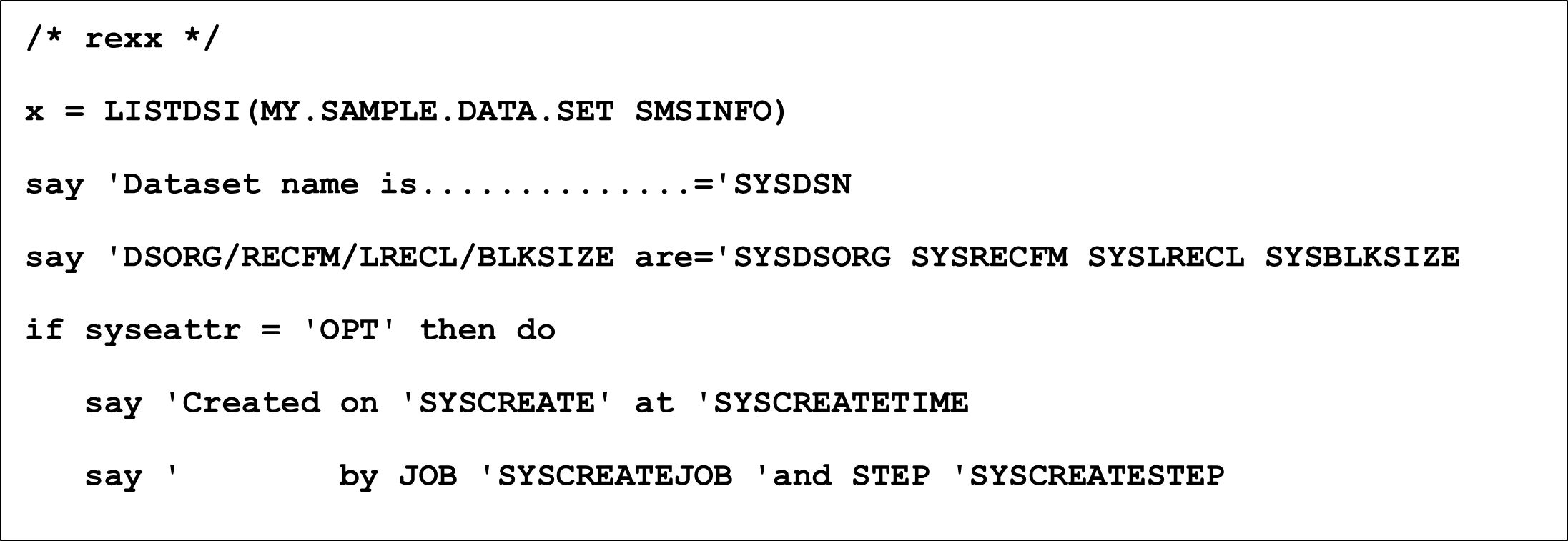 The determine under exhibits a easy REXX exec that shows a few of the extra fascinating LISTDSI variables for a specified dataset title, together with the date and time the dataset was created: