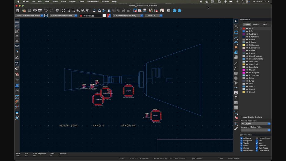 As a substitute of trying to render Doom pixel-by-pixel — which preliminary checks confirmed would crawl alongside at roughly 0.15 FPS — Ayles realized that the unique engine already builds geometry as vectors. PCB traces, in spite of everything, are simply vectors in copper. By extracting wall and sprite knowledge instantly from the sport’s drawsegs[] and vissprites[] buildings, KiCad solely has to replace 100–300 line segments per body as a substitute of pushing tens of 1000’s of pixels. That effectivity is what makes this weird experiment playable, clocking in at round 10–25 frames per second, relying on the {hardware}.