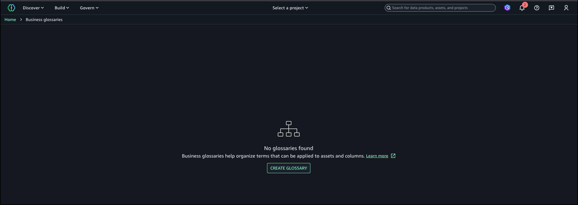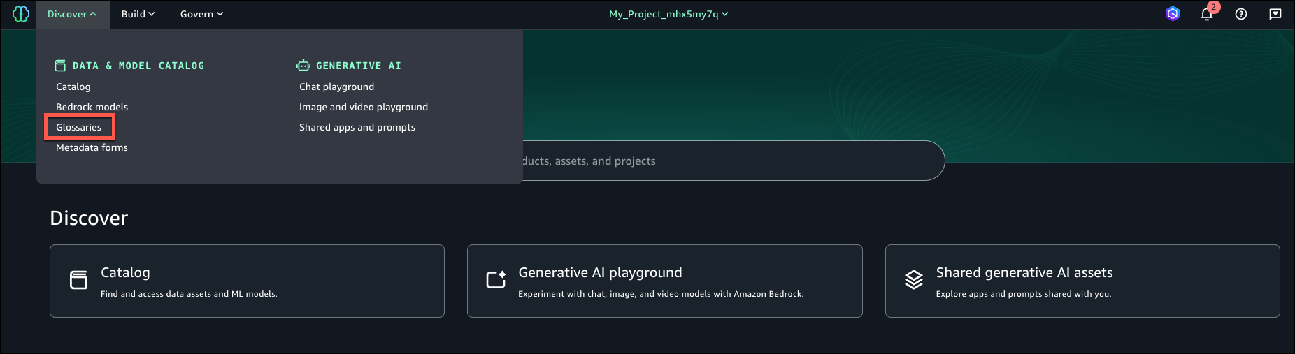 1. In SageMaker Unified Studio, on the Uncover menu, select Glossaries.