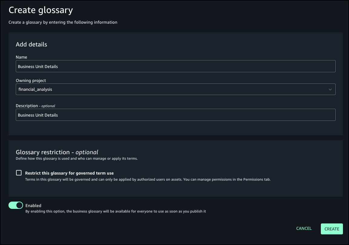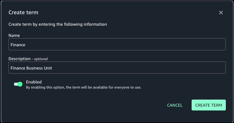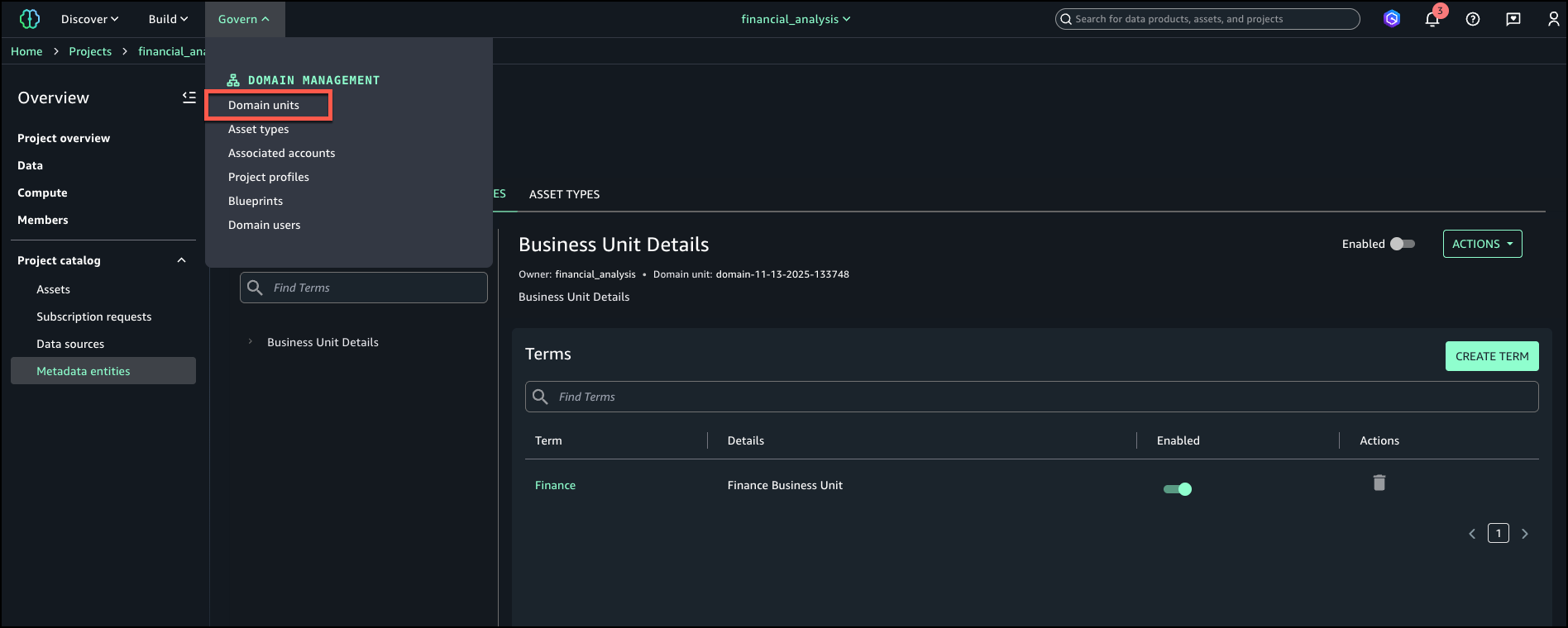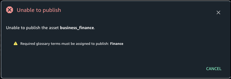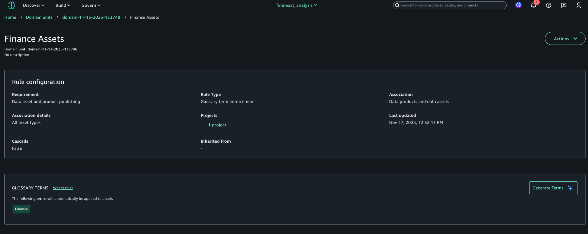 For this submit, we discover a monetary companies use case. Our instance a monetary companies firm defines a rule requiring all datasets revealed from the venture to have ‘Finance’ glossary related: