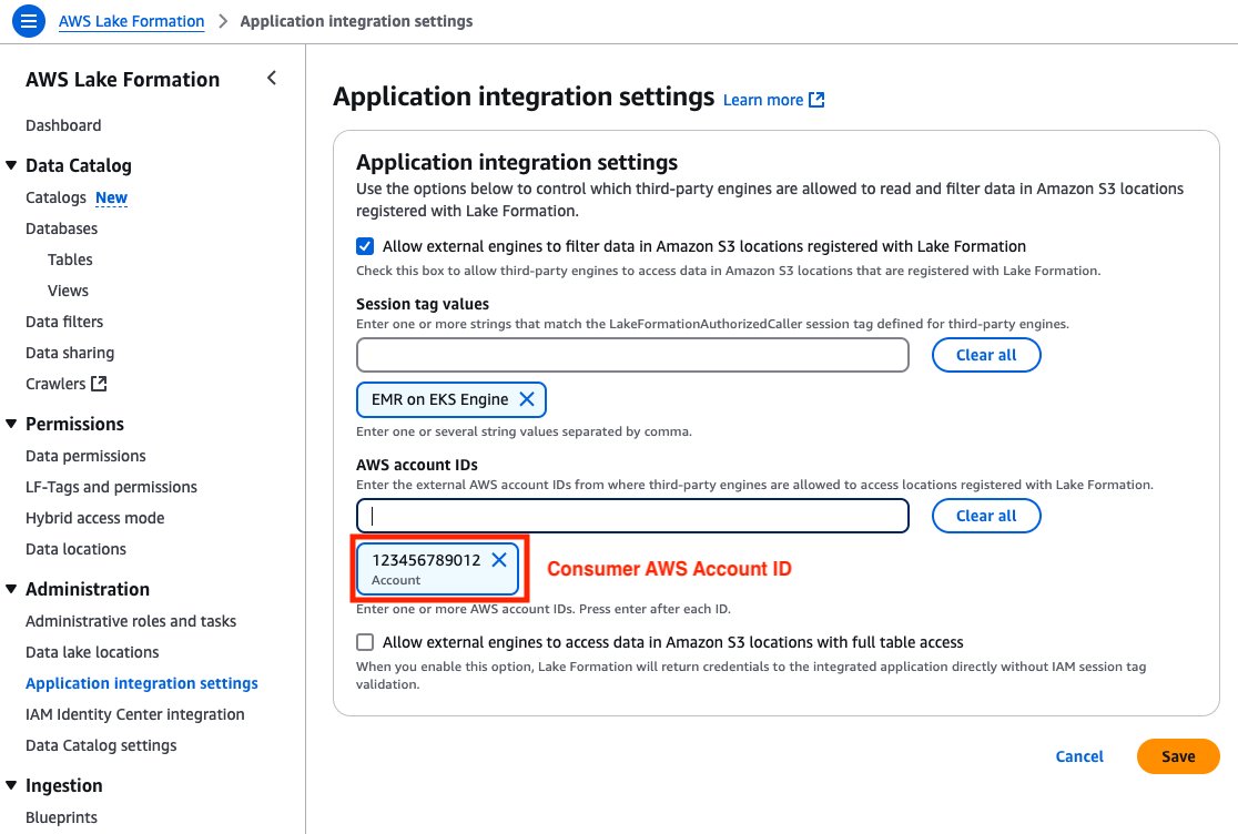 A client account ID and an EMR on EKS Engine session tag should set within the producer’s setting. It permits the buyer to entry the producer’s AWS Glue tables ruled by Lake Formation. Full the next steps to allow cross-account entry: