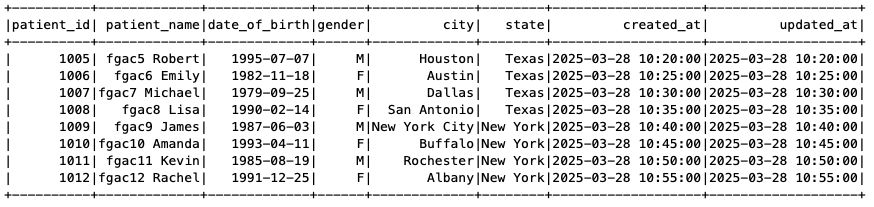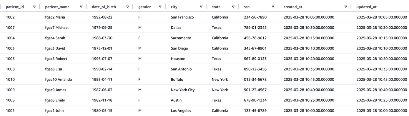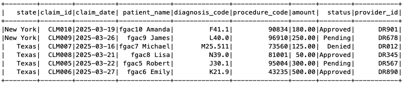 The Sufferers Care Group PySpark job has question entry to the Sufferers and Claims tables. The Sufferers desk has filtered out the SSN column and solely exhibits data for Texas and New York declare data, as laid out in our FGAC setup.