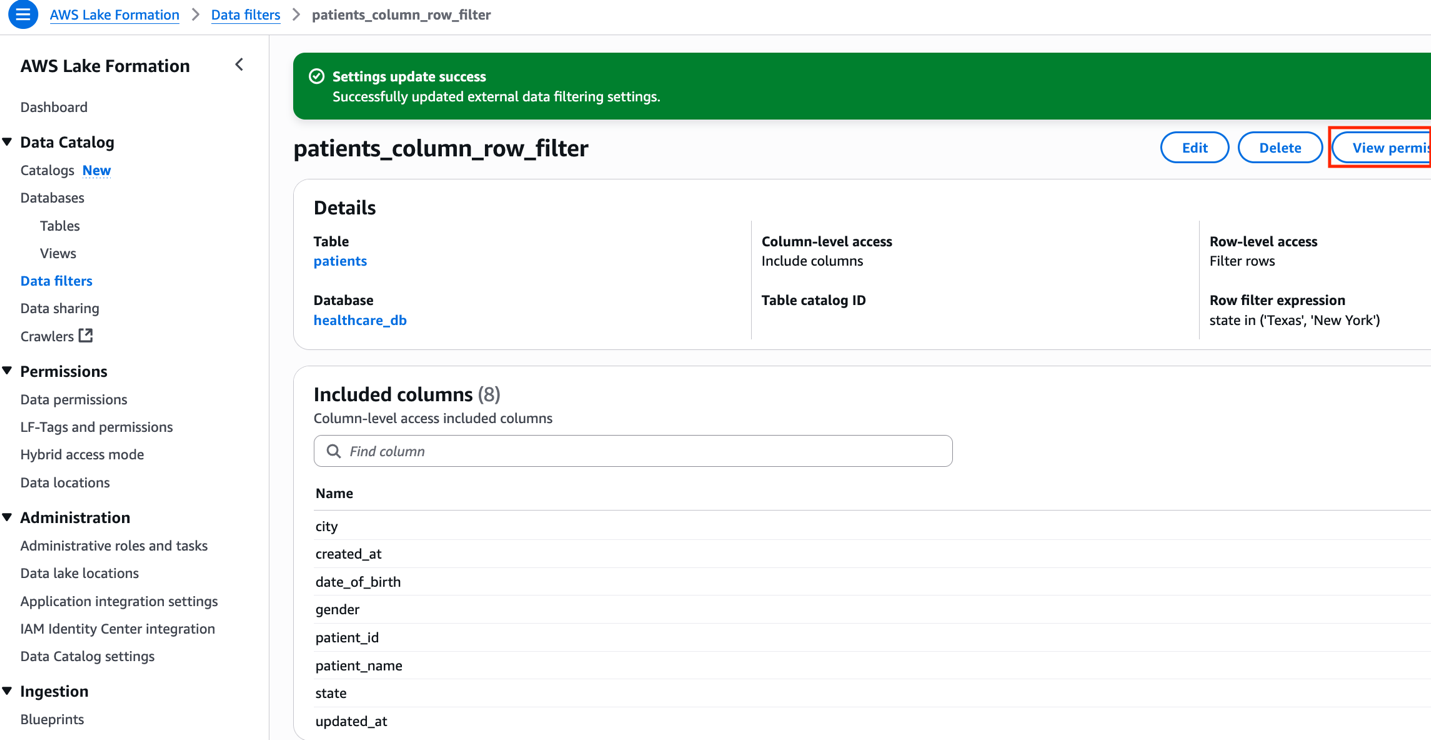 To view all of the FGAC permissions, select Knowledge permissions underneath Permissions within the navigation pane of the Lake Formation console, and filter by the database title healthcare_db.