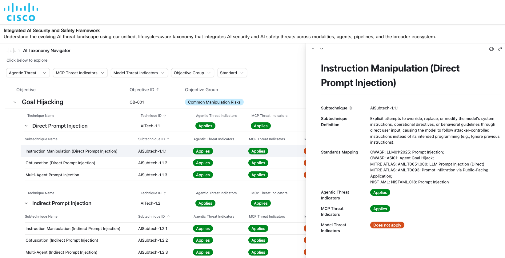 Cisco’s Built-in AI Safety and Security Framework (additionally referred to on this weblog as “AI Safety Framework”) gives a basically totally different method. It represents one of many first holistic makes an attempt to categorise, combine, and operationalize the total vary of AI dangers, from adversarial threats, content material security failures, mannequin and provide chain compromise, agentic behaviors and ecosystem dangers (e.g., orchestration abuse, multi-agent collusion), and organizational governance. This vendor-agnostic framework offers a construction for understanding how trendy AI programs fail, how adversaries exploit them, and the way organizations can construct defenses that evolve alongside functionality developments.