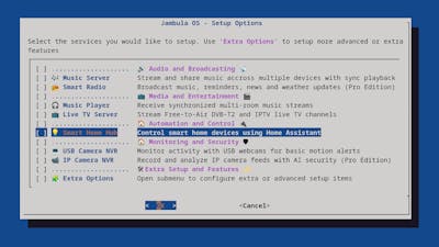 Upon first boot, the OS presents the person with QR Codes displayed on the terminal — one to connect with an on-device wi-fi entry level, the opposite to begin an SSH connection. As soon as related, the setup wizard walks the person by way of enabling quite a lot of system providers together with file, music, video, and safety digital camera servers, file sharing providers, and even Residence Assistant for residence automation.