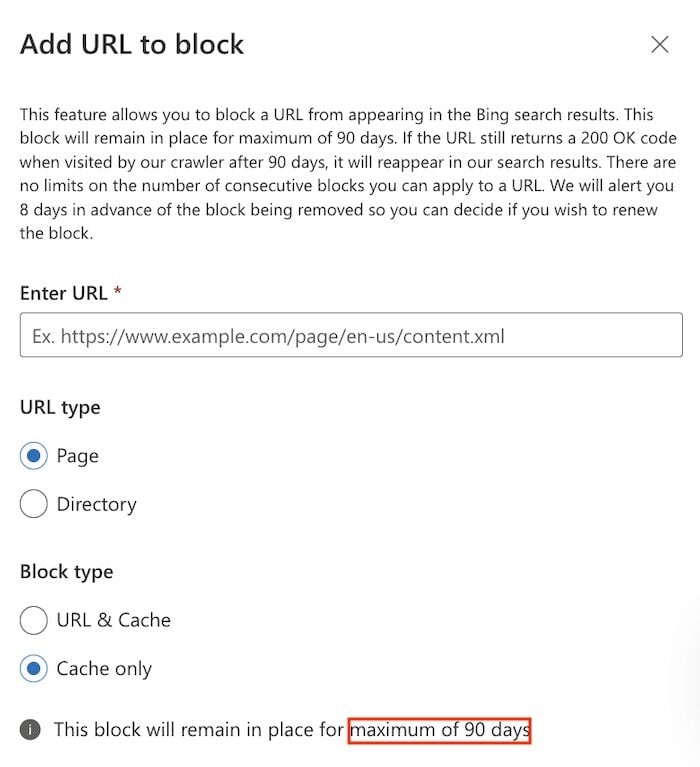An identical function in Bing Webmaster Instruments, referred to as “Block URLs,” hides pages from Bing search for roughly 90 days.