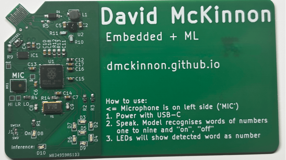 A customized PCB was designed, with McKinnon’s contact data silkscreened on the entrance. The RP2040 was accompanied by flash reminiscence, energy regulation circuitry, a microphone to seize an individual’s voice, and different supporting parts. When the mannequin makes a prediction, the result’s displayed on a makeshift seven-segment show produced from particular person LEDs.