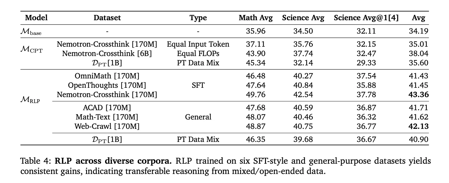 Reinforcement Studying Pretraining (RLP) is orthogonal to post-training pipelines (SFT, RLVR) and exhibits compounding enhancements after normal alignment. As a result of the reward is computed from mannequin log-evidence relatively than exterior verifiers, it scales to domain-agnostic corpora (net crawl, tutorial textual content, textbooks) and SFT-style reasoning corpora, avoiding the brittleness of slender curated datasets. In compute-matched comparisons (together with CPT with 35× extra tokens to match FLOPs), RLP nonetheless led on total averages, suggesting the enhancements derive from goal design, not price range.
