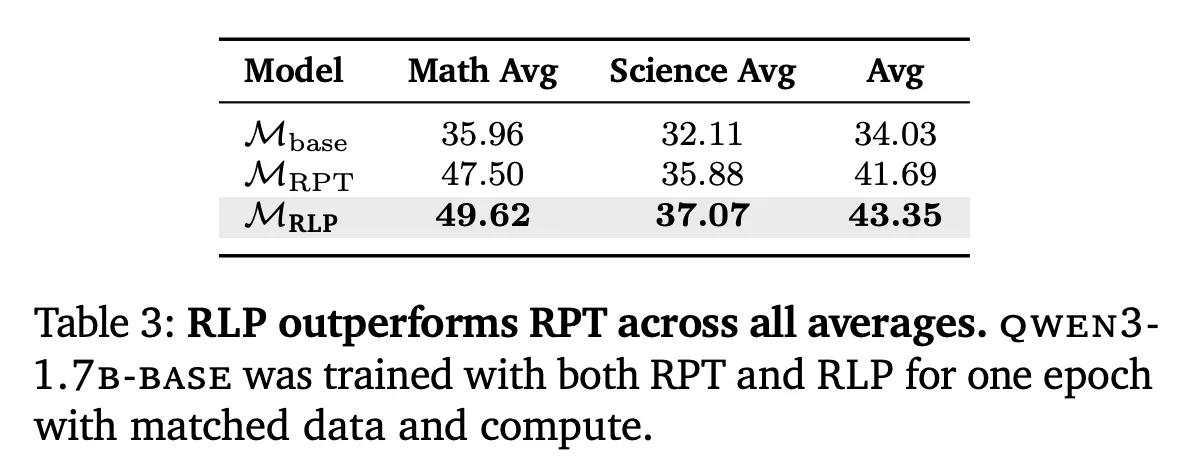 RPT comparability: Underneath matched knowledge and compute with Omni-MATH-style settings, RLP outperformed RPT on math, science, and total averages—attributed to RLP’s steady information-gain reward versus RPT’s sparse binary sign and entropy-filtered tokens.