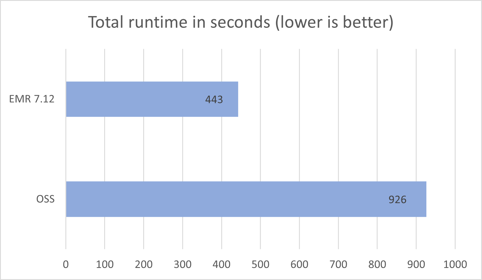 The typical runtime for the three iterations on Amazon EMR 7.12 with Iceberg enabled was 443.58 seconds, demonstrating a 2.08x pace improve in comparison with open supply Spark 3.5.6 and Iceberg 1.10.0. The next determine presents the whole runtimes in seconds.