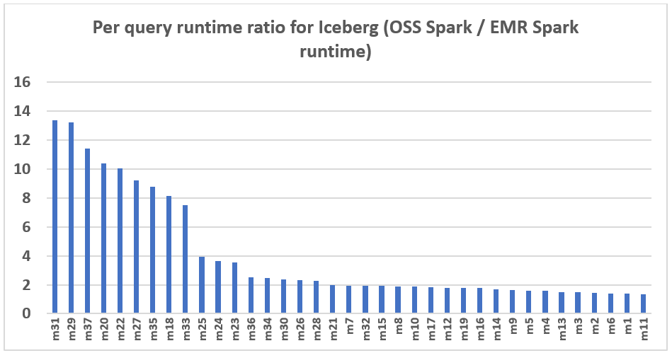 The next chart demonstrates the per-query efficiency enchancment of Amazon EMR 7.12 relative to open supply Spark 3.5.6 and Iceberg 1.10.0. The extent of the speedup varies from one question to a different, with the quickest as much as 13.3 occasions quicker for question m31, with Amazon EMR outperforming open supply Spark with Iceberg tables. The horizontal axis arranges the TPC-DS 3TB benchmark queries in descending order based mostly on the efficiency enchancment seen with Amazon EMR, and the vertical axis depicts the magnitude of this speedup as a ratio.