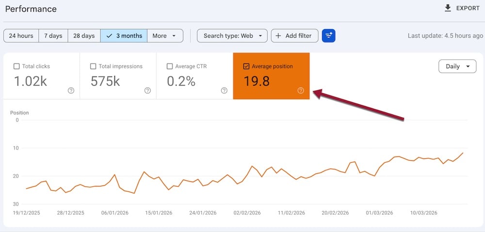 The time period refers back to the total common place as proven on the high of the Efficiency report. It’s the aggregated place of your web site throughout all rating queries. Google’s search outcomes usually present 10 natural listings per web page. Thus a median place of 25 suggests a median rating on web page 3.