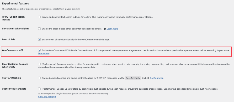 Choice 1: Head over to WordPress DashboardWooCommerceSettingsSuperiorOptions and allow WooCommerce MCP.