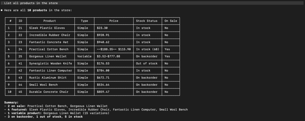 So once we say, “Checklist all merchandise beneath $20 USD,” MCP interprets that into one thing WooCommerce understands, runs it securely, and brings again the outcomes.