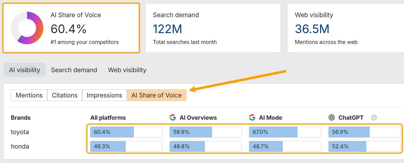 - Measure your AI Share of Voice in comparison with opponents: Benchmark your presence towards rivals in AI search.