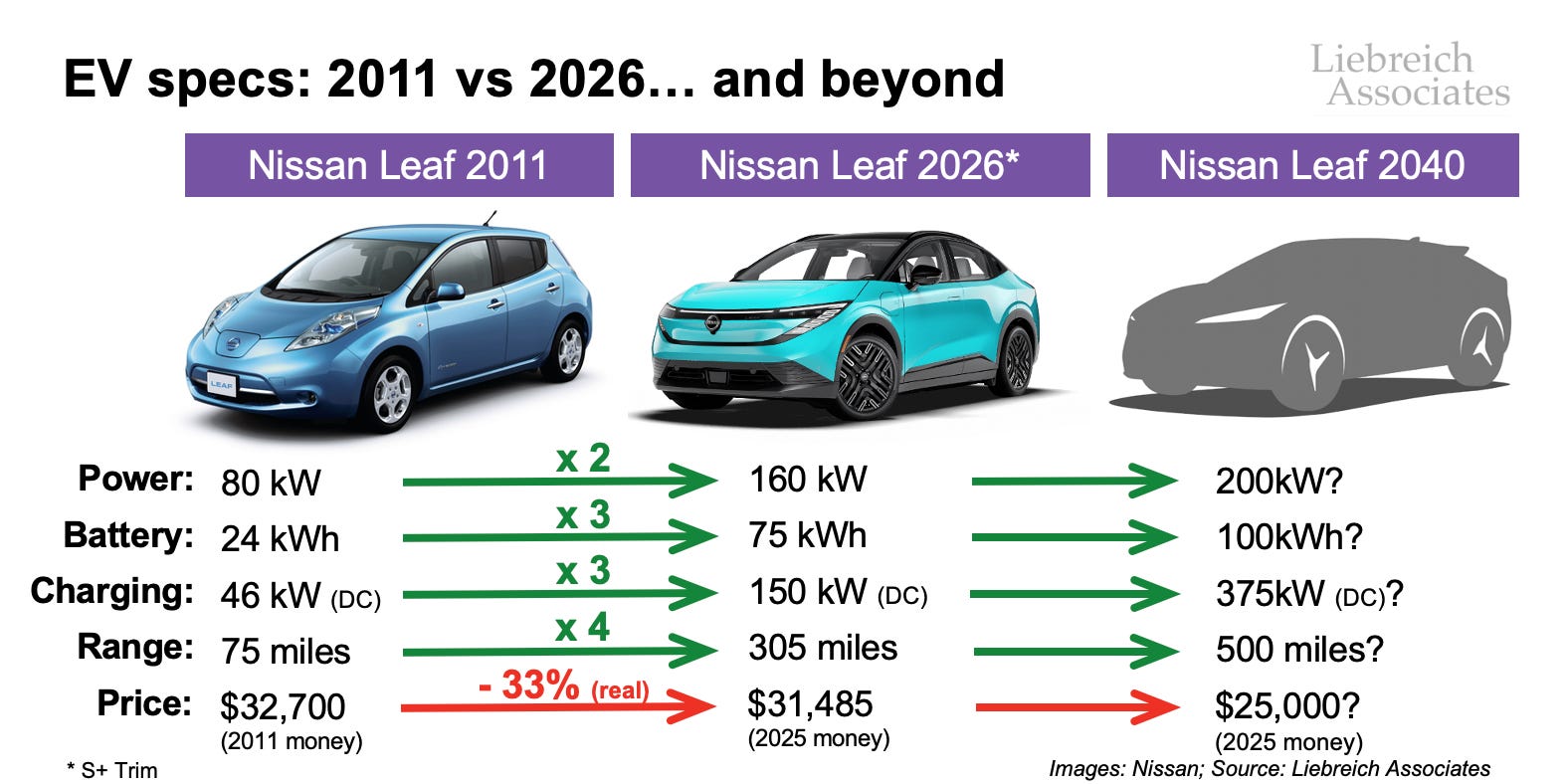 It’s a terrific slide. It reveals that the facility capability of the Nissan LEAF has doubled since its inception, the battery capability has greater than tripled, the charging capability has greater than tripled, the vary has elevated 4 occasions over, and … the price has dropped by about 33%.