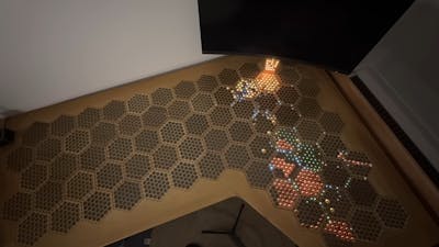 Full Stack Woodworking constructed the picket hexagonal panels, that are themselves made up of smaller hexagons, by laminating layers of laser-cut plywood. Optical fiber tubes for the LEDs had been embedded in these panels with UV-curing resin, then the panels had been stuffed with two-part epoxy. Going through on a CNC router made the outer faces of the panels good and clean.