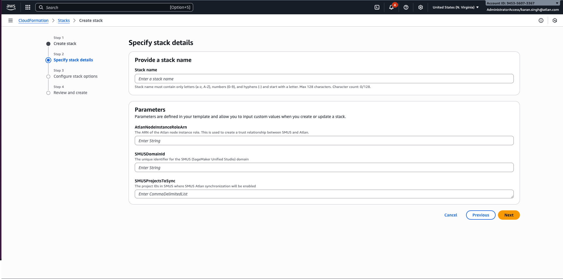 Contact your Atlan administrator to acquire the Amazon Useful resource Title (ARN) of the Atlan Account Node Occasion IAM function. You’ll need this worth when configuring the CloudFormation stack in AWS.