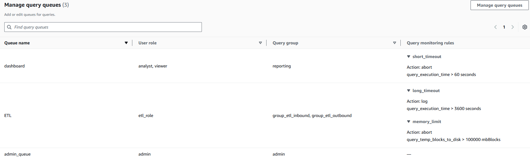 Every queue (dashboard, ETL, admin_queue) is mapped to particular person roles and question teams, creating clear boundaries between question guidelines. The question monitoring guidelines implement automated useful resource governance—for instance, the dashboard queue routinely stops queries exceeding 60 seconds (short_timeout) whereas permitting ETL processes longer runtimes with totally different thresholds. This configuration helps forestall useful resource monopolization by establishing separate processing lanes with applicable guardrails, so crucial enterprise processes can keep crucial computational sources whereas limiting the affect of resource-intensive operations.