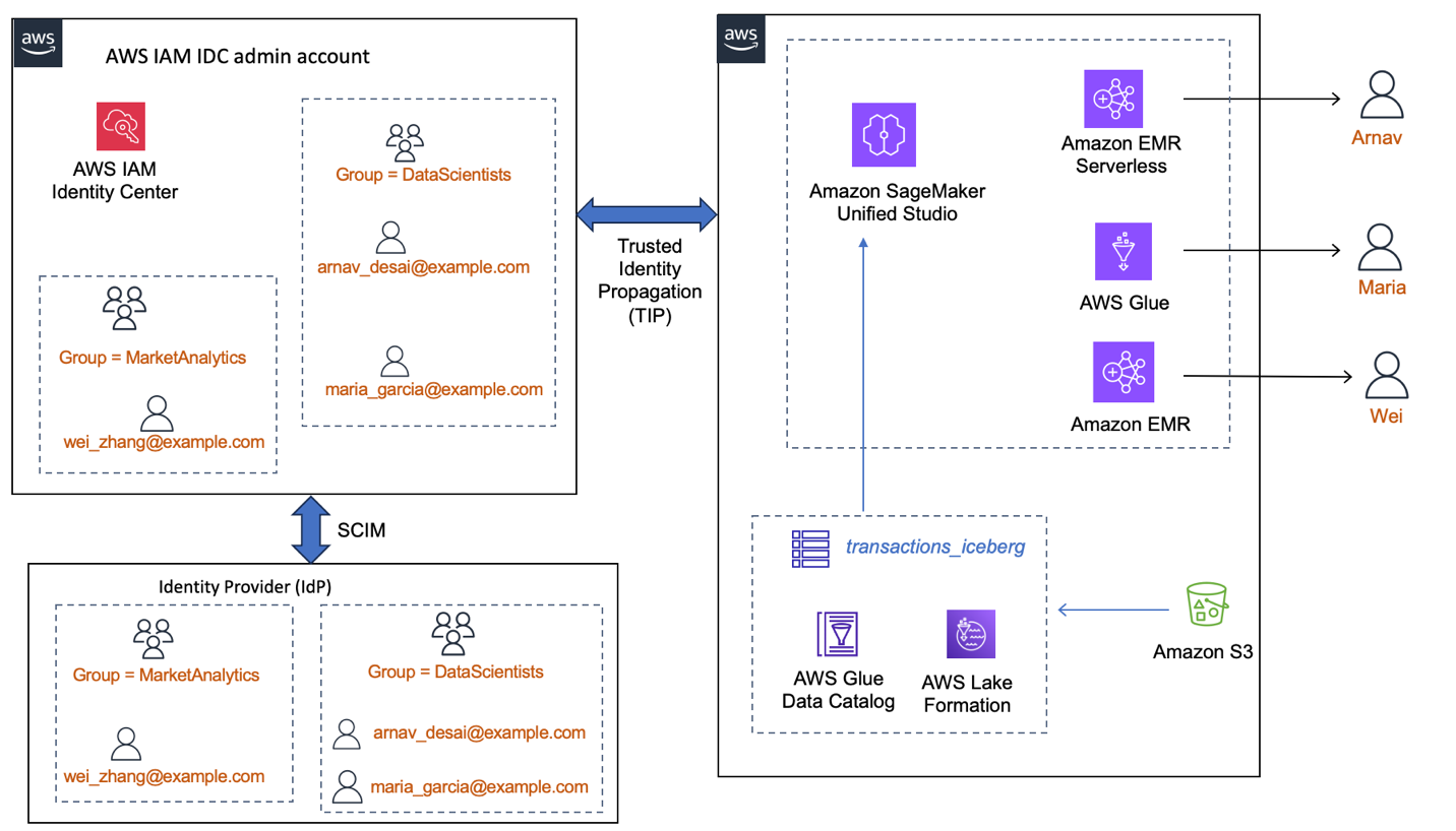 A monetary companies firm processes knowledge from thousands and thousands of retail banking transactions per day, pooled into their centralized knowledge lake and accessed by conventional company identities. Their machine studying (ML) platform staff want to allow hundreds of their knowledge scientists, working throughout completely different groups, with the suitable dataset and instruments in a safe, scalable and auditable vogue. The platform staff chooses to make use of SageMaker Unified Studio, combine their IdP with IAM Identification Heart, and handle entry for his or her knowledge scientists on the info lake tables utilizing fine-grained Lake Formation permissions.