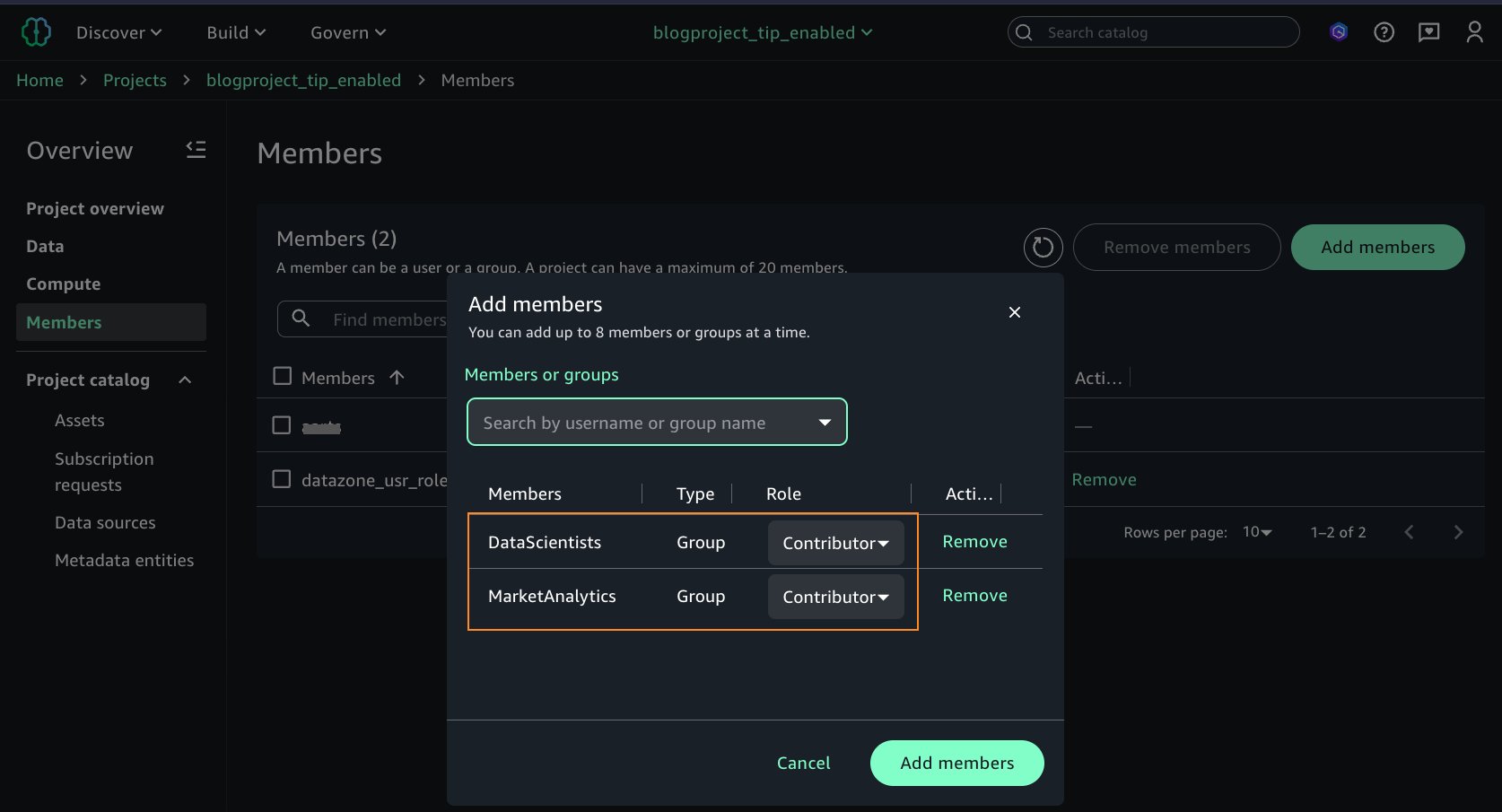 Arnav want to collaborate with different staff members. After creating the mission, he grants entry on the mission to further IAM Identification Heart teams. He provides the 2 IAM Identification Heart teams, DataScientists and MarketAnalytics, as Members of kind Contributor to the mission, as proven within the following screenshot.