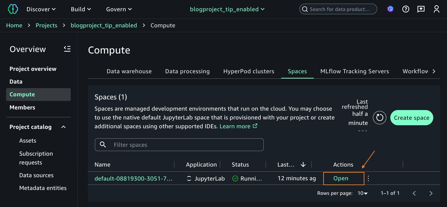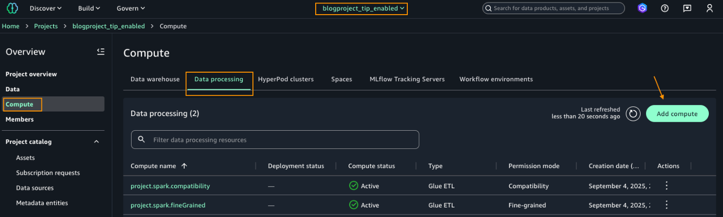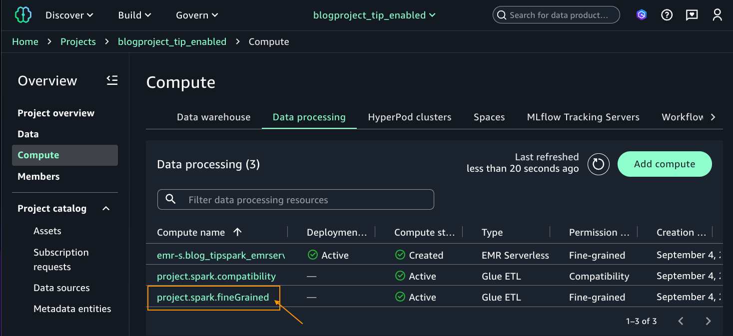 blogproject_tip_enabled. From the left navigation pane, select Compute. On Knowledge processing tab, it’s best to see two computes created by default in Energetic standing (mission.spark.compatibility and mission.spark.fineGrained) with Kind Glue ETL. For added particulars on these compute varieties, consult with AWS Glue ETL in Amazon SageMaker Unified Studio. - Choose the mission.spark.fineGrained and launch the Jupyter pocket book with the PySpark kernel.