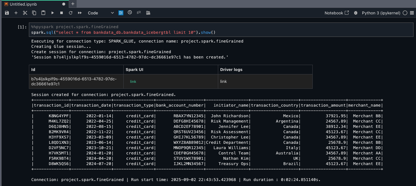 This verifies LF-Tags based mostly entry to Maria on the bankdata_db.bankdata_icebergtbl utilizing Spark session in AWS Glue fine-grained entry management (FGAC) compute.