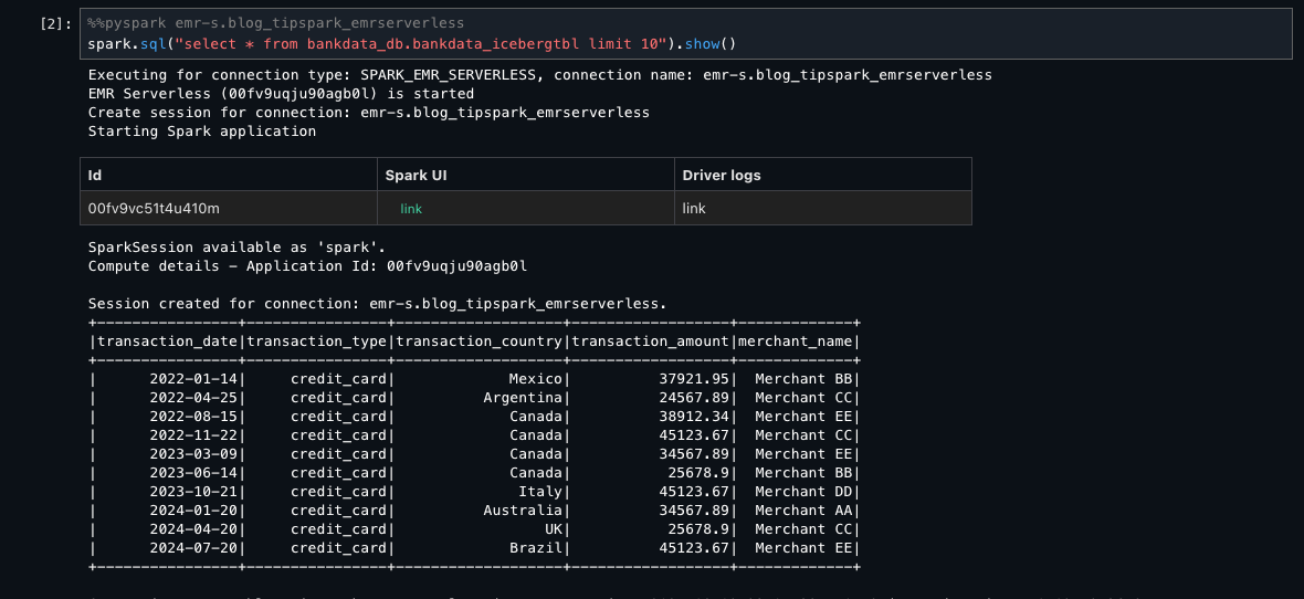 To confirm what entry Wei has utilizing EMR Serverless and AWS Glue, you possibly can signal out and register as consumer Wei. Enter the Spark SELECT queries on the identical desk. Wei shouldn’t see the three personally identifiable data (PII) columns transaction_id, bank_account_number, and initiator_name, which have been tagged as transactions=secured.
