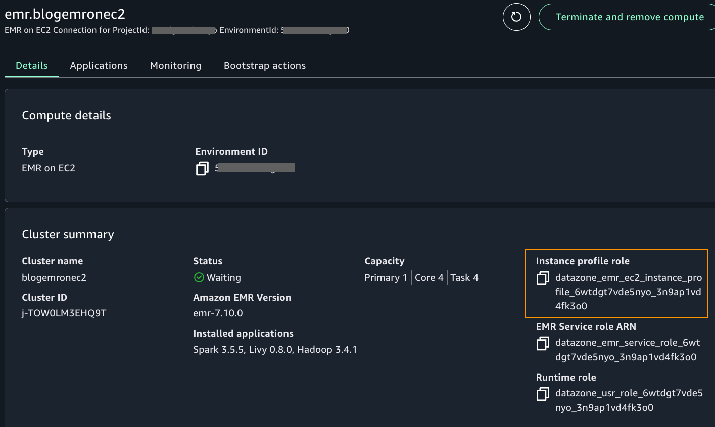 - After the cluster is provisioned, find the occasion profile function title within the compute particulars web page, as proven within the following screenshot.
