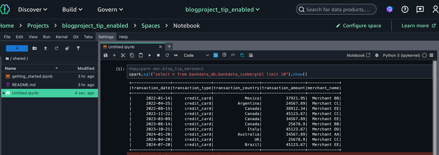 Now, your setting is prepared, and you’ll run Spark queries and check your entry to the deskbankdata_icebergtbl. - On the Launcher window, underneath Pocket book, select Python 3(ipykernel).