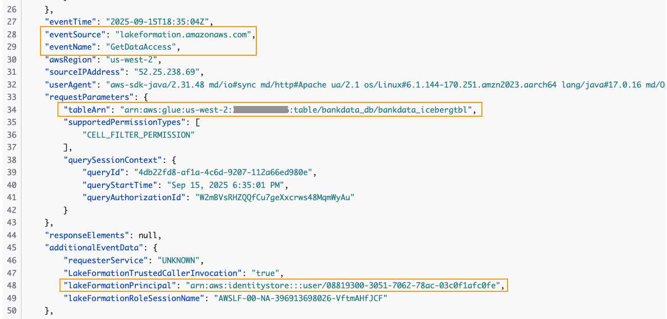 You possibly can hint the consumer entry of the desk within the CloudTrail logs for EventName=GetDataAccess. Within the related CloudTrail log proven under, we discover that the UserID for Wei is supplied underneath additionalEventData subject, whereas requestParameters has the tableARN.