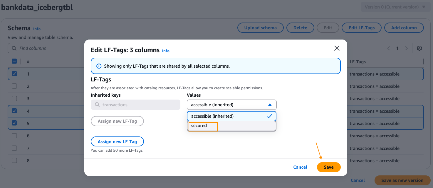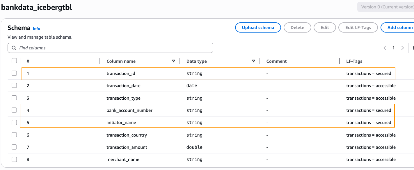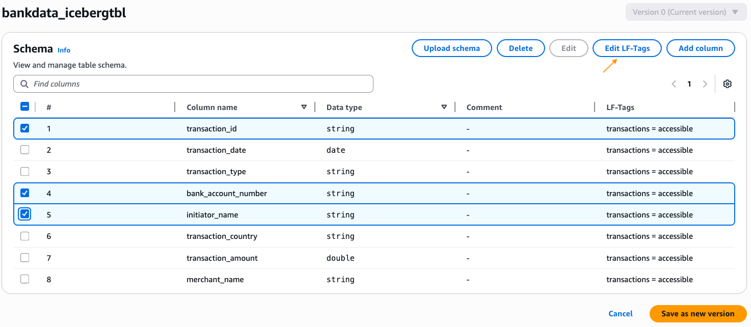 bankdata_icebergtbland confirm that the LF-Tagtransactions=accessibleis inherited by the desk. - Edit the schema of the desk and alter the LF-Tag worth on the columns