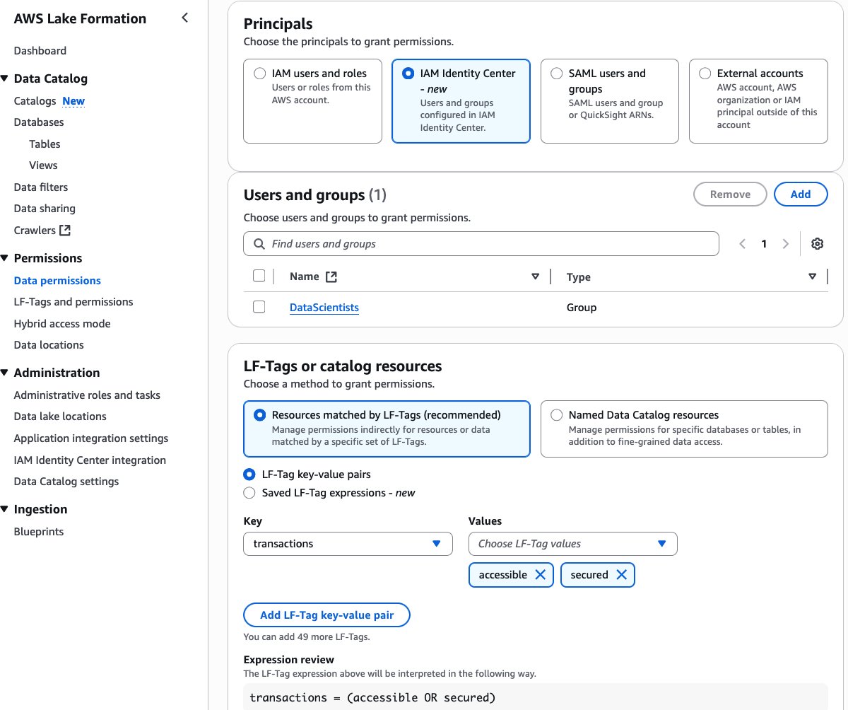DataScientistsfor Principals. Choose LF-Tagstransactionsand each the valuesaccessible,secured. Select Database DESCRIBE and Tables SELECT permissions. Select Grant.