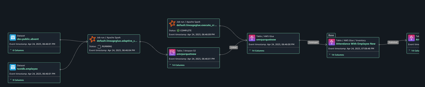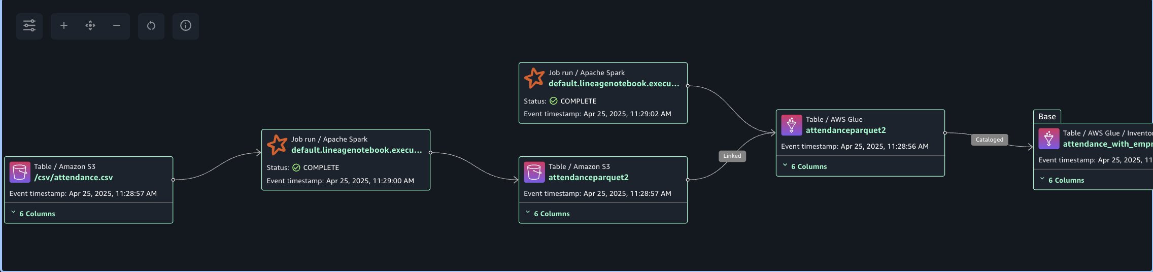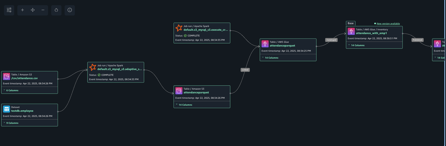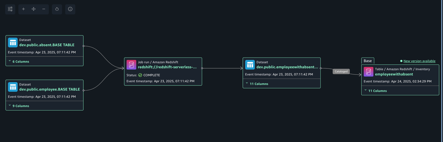 To show the lineage, we learn worker information from an RDS for MySQL desk and an attendance dataset from Amazon Redshift, and be a part of each datasets. Lastly, we write the info to Amazon S3 and create the attendance_with_employee desk within the Information Catalog. Full the next steps: