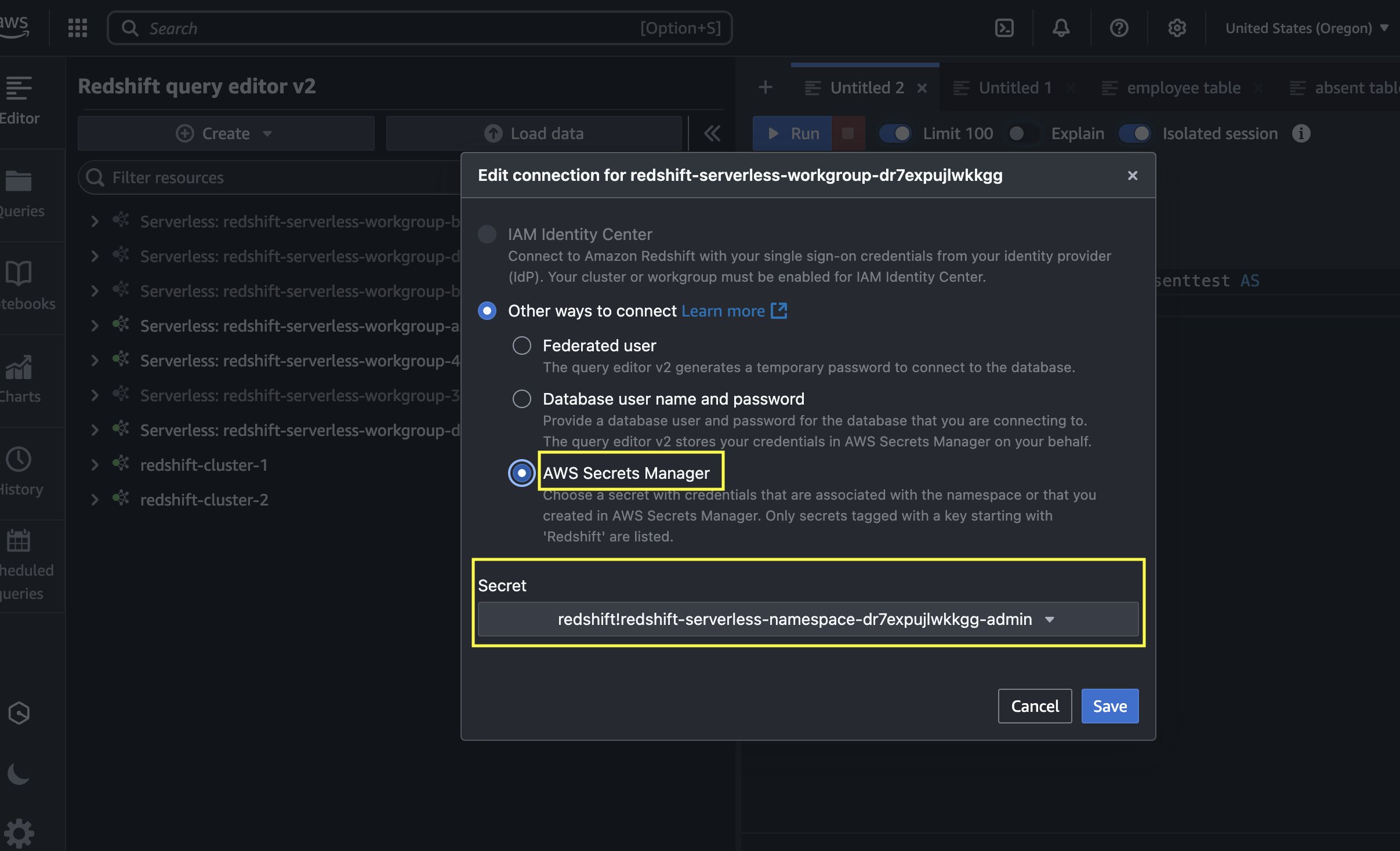 absent_df = spark.learn.format("jdbc").possibility("url", "jdbc:redshift://redshiftserverlessendpoint:5439/dev").possibility("dbtable", "public.absent").possibility("consumer", "admin").possibility("password", "xxxxxxxxxx").load()