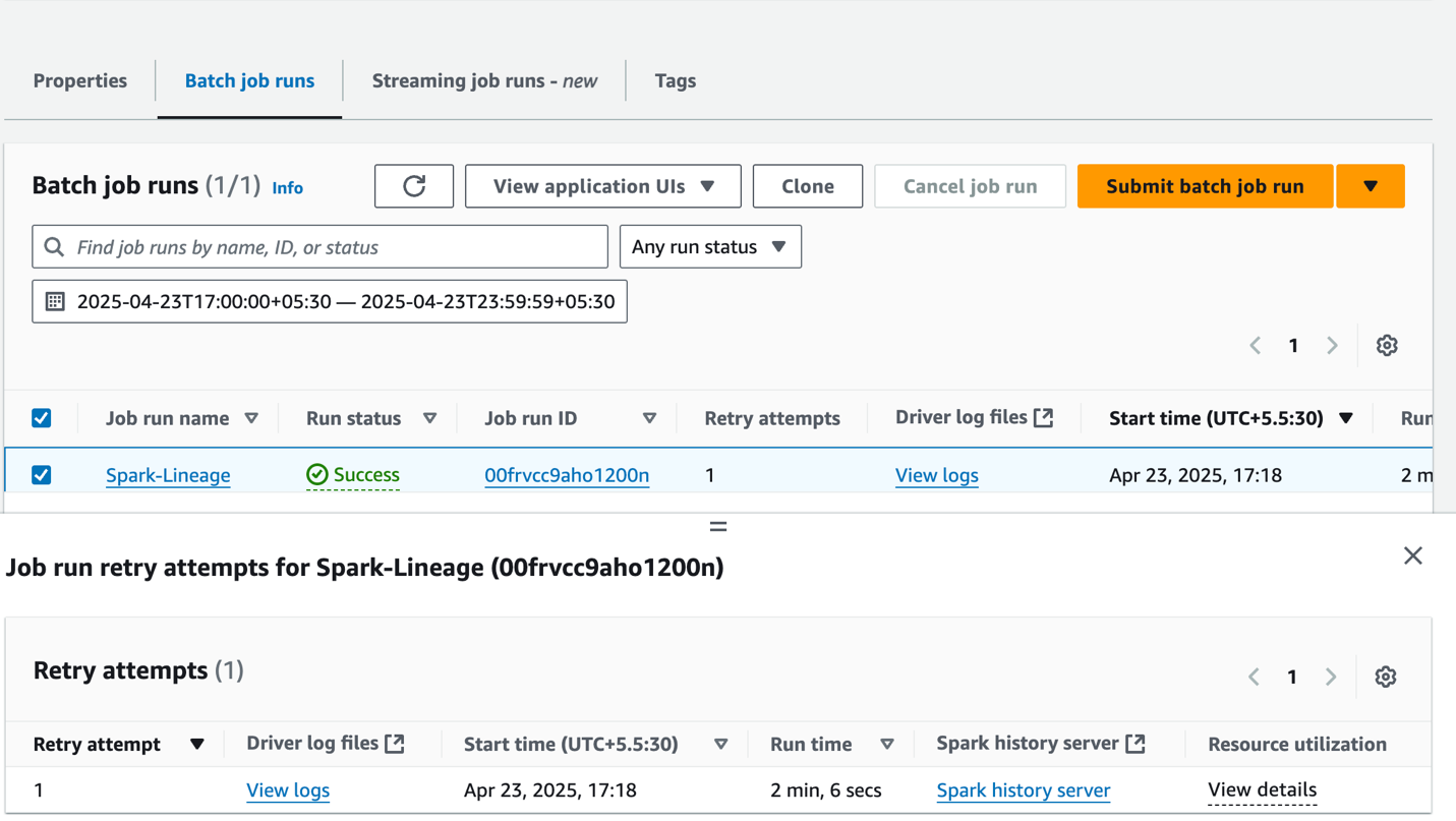 aws emr-serverless start-job-run --application-id 00frv81tsqe0ok0l --execution-role-arn arn:aws:iam::{account_id}:function/service-role/AmazonEMR-ExecutionRole-1717662744320 --name "Spark-Lineage" --job-driver '{