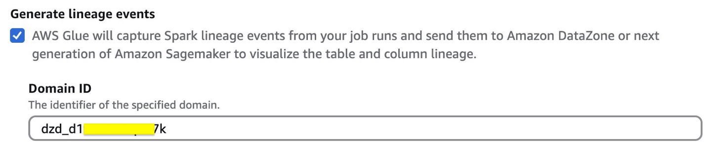 2. Allow Generate lineage occasions and supply the area ID (retrieve from the CloudFormation template output for DataZoneDomainid; it can have the format dzd_xxxxxxxx)